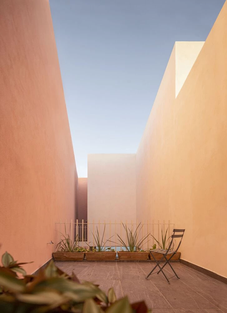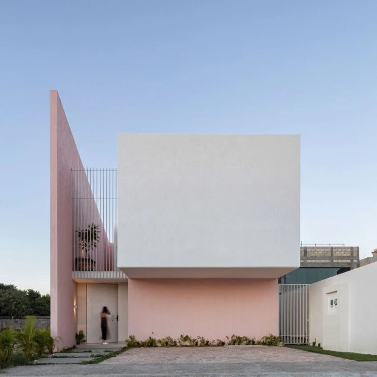 Destacando en la fachada hacia el poniente, un imponente muro pantalla de más de 8 metros de altura surge como una escultura que añade profundidad y un toque de color rosa.