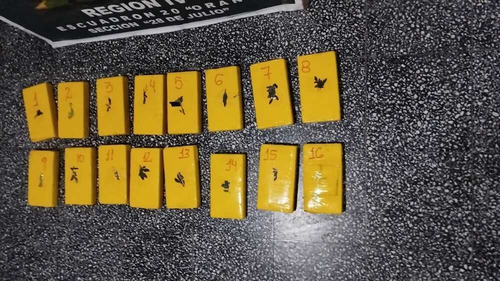 Los funcionarios extrajeron dos mochilas, dentro de las cuales había un total de 16 paquetes rectangulares, que contenían una sustancia pulverulenta blancuzca. La misma fue sometida a las pruebas de campo Narcotest y arrojó resultado positivo para cocaína, con un peso de 17 kilos 58 gramos.