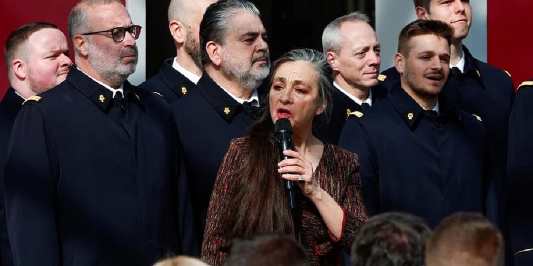 La gente aplaudió cuando Ringer, conocida por su grupo de rock Les Rita Mitsouko, entonó el comienzo del estribillo de La Marsellesa, cambiando una línea por “A las armas, ciudadanos y ciudadanas” (en francés, “Aux armes, citoyens, citoyennes”). En el himno original solo dice “ciudadanos”.