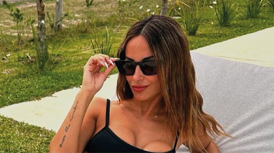 ¿Los detalles? Se trata de una dupla supercanchera conformada por un corpiño rectangular simple y una bombacha colaless diminuta de tiro alto. Canchera y coqueta como ella sola, combinó el equipo de alto verano con un par de lentes de sol negros de formato geométrico con vidrio opaco.