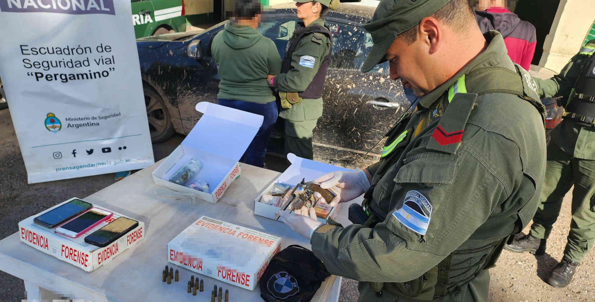 Durante la inspección, el can antinarcóticos “Oreo” alertó a los gendarmes sobre la existencia de sustancias ilícitas dentro de una riñonera y en el interior de su vehículo. Eso derivó en el hallazgo de cocaína, marihuana, un revólver, municiones y dinero en efectivo.