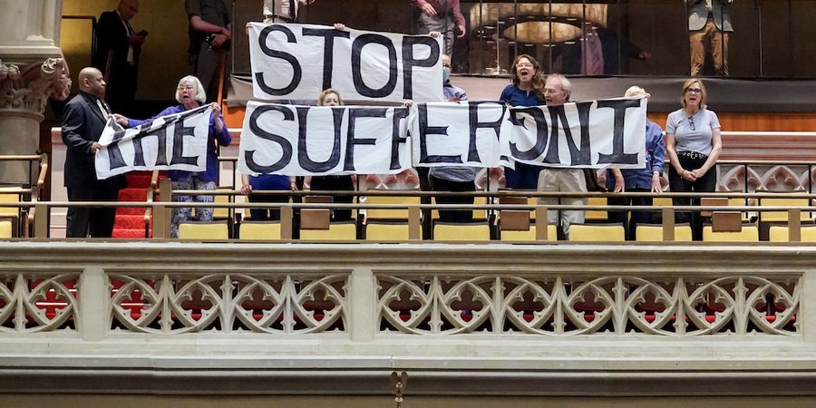 Defensores de Compassion and Choices interrumpen sesiones de la legislatura estatal de Nueva York a fin de ejercer presión sobre los legisladores para que legalicen la ayuda médica para morir, en Albany, Nueva York, el 21 de mayo de 2024. (Cindy Schultz/The New York Times)