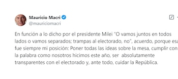 “En función a lo dicho por el presidente Milei “O vamos juntos en todos lados o vamos separados; trampas al electorado, no”, acuerdo, porque esa fue siempre mi posición: Poner todas las ideas sobre la mesa, cumplir con la palabra como nosotros hicimos este año, ser absolutamente transparentes con el electorado y, ante todo, cuidar la República”, publicó el exmandatario en sus redes sociales.