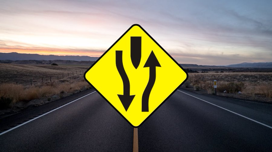 La señal de tránsito P 20, vista en autopistas y rutas, se caracteriza por mostrar dos flechas con un objeto en el centro, al representar una calzada dividida.