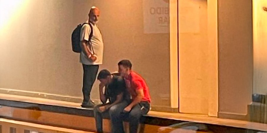 Luego del partido, se vio al entrenador en las afueras del José María Minella siendo consolado por un colaborador