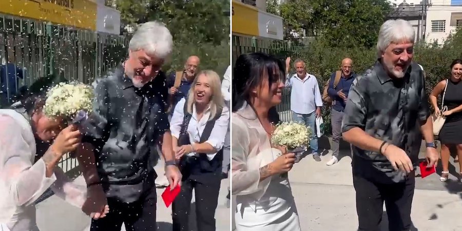 La ceremonia de civil se realizó en el registro de la comuna 5, ubicada en Carlos Calvo al 3307 en uno de los laterales de la plaza Mariano Boedo. Fue una fiesta íntima ya que sólo asistieron familiares y un grupo selecto de amigos. Apenas salió tras decir el “sí quiero” se realizó la foto de rigor y sabiendo que siempre habrá un gen barra en su vida, le advirtió al fotógrafo que “ojo que estos tiran piedras”. Afortunadamente sólo fue arroz lo que recibieron los flamantes tortolitos. ¿Por qué no estaba La Doce en pleno con todo su cotillón? Porque a ellos se los espera en la celebración del fin de semana que se hará en una quinta bonaerense.