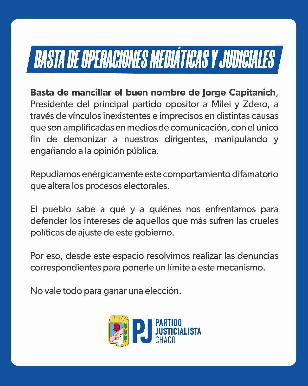 Aseguran que “desde hace semanas se despliega una campaña coordinada, sistemática y altamente financiada contra el candidato Jorge Capitanich en redes sociales, plataformas digitales y medios tradicionales de comunicación”, y detallan links y capturas de algunas de las publicaciones.