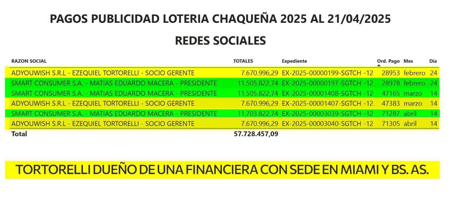 En 2025 también Lotería Chaqueña sumó a su nómina de pagos a AdYouWish y Smart Consumer por “servicio publicitario”. Sin contar ajustes por inflación y otros posibles contratos, estas cuatro firmas -todas con sede en Buenos Aires- le habrían costado al Chaco al menos $ 2.625 millones en 14 meses, facturando, a veces por el mismo concepto, desde $ 8 millones hasta $ 45 millones por mes.