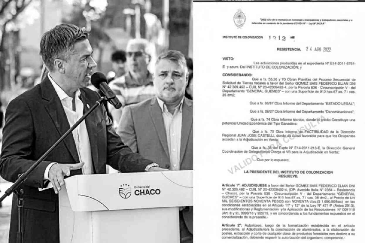 Fernando Santiago Gómez Bais, uno de los hijos del actual ministro de Gobierno, Jorge Fernando ‘Pato’ Gómez, recibió en concesión 2.395 hectáreas, 4 áreas, 57 centiáreas, 37 decímetros cuadrados. Más tarde fue el turno de su hermano, Federico Elian Gómez Bais, a quien se le cedieron más de 910 hectáreas.