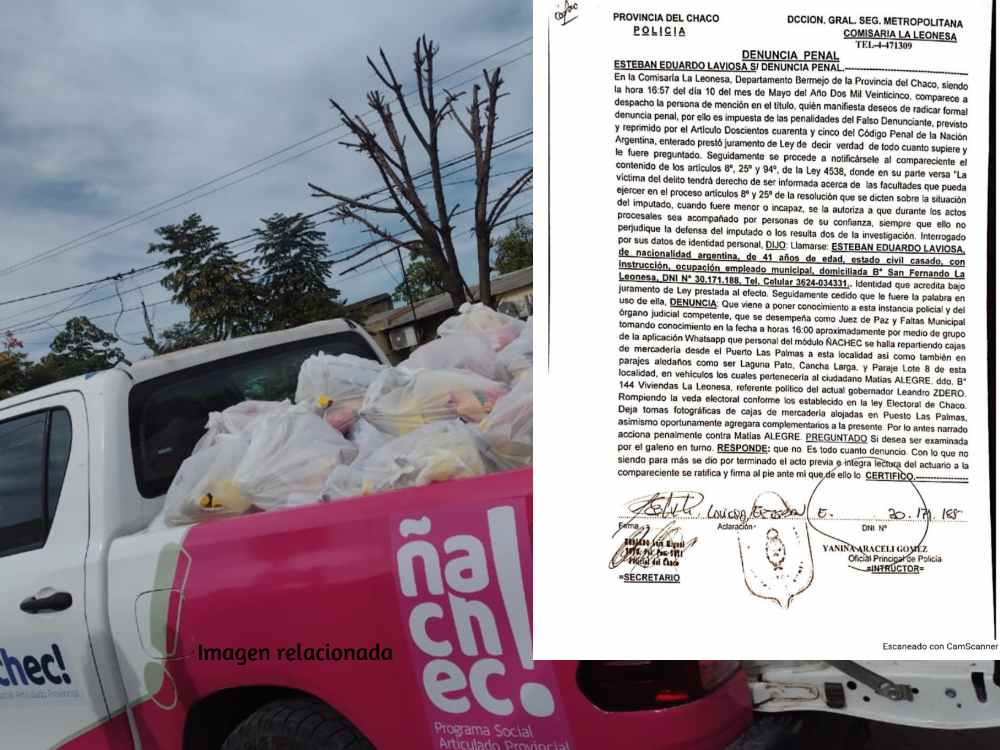 Según consta en la denuncia, alrededor de las 16 horas, Laviosa fue alertado a través de un grupo de WhatsApp sobre el desplazamiento de vehículos pertenecientes al ciudadano Matías Alegre, domiciliado en el barrio 144 Viviendas de La Leonesa, que estarían transportando y distribuyendo cajas de alimentos del programa provincial Ñachec.
