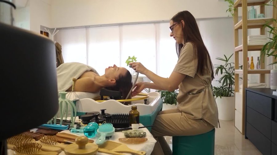 La experiencia comienza con un diagnóstico detallado del cuero cabelludo, adaptando los tratamientos a las necesidades específicas de cada cliente. Luego los invita a recostarse en una camilla y allí empieza a masajear la cabeza con técnicas de acupresión, estimulando la circulación y promoviendo la relajación. Hasta que aparece la verdadera atracción: un aro dorado que larga agua en forma de lluvia uniforme y genera una experiencia sensorial. Se completa con un brushing e infusión.