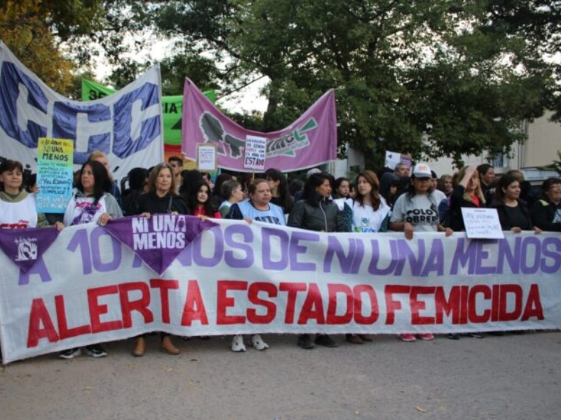 “A 10 años de Ni una Menos. Alerta, Estado femicida”, rezaba la pancarta principal de la marcha que comenzó en el cruce de las avenidas San Martín y 9 de Julio y se dirigió por esa arteria hasta frente a Casa de Gobierno. En ese punto de la ciudad, se leyó un documento conjunto donde se denunció los despidos de miles de trabajadores y trabajadoras del Estado, el desmantelamiento de áreas esenciales para la protección social, la salud, la ciencia, la producción y la agricultura familiar. “Estamos ante un plan sistemático de exclusión que deja a millones de compatriotas a la intemperie”, señalaron.