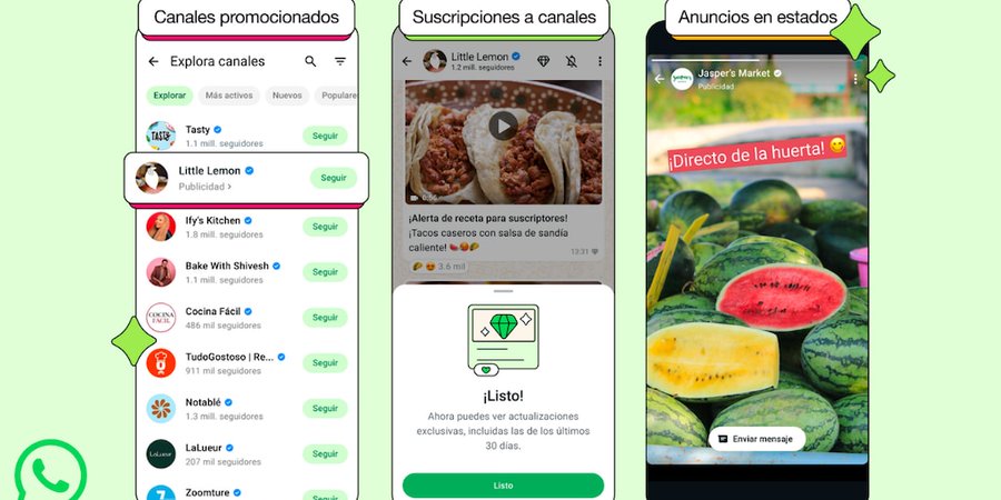 WhatsApp presentó tres nuevas funciones para la pestaña de novedades, enfocadas en los canales y estados: canales promocionados, anuncios en los estados y la opción de suscribirse a canales.