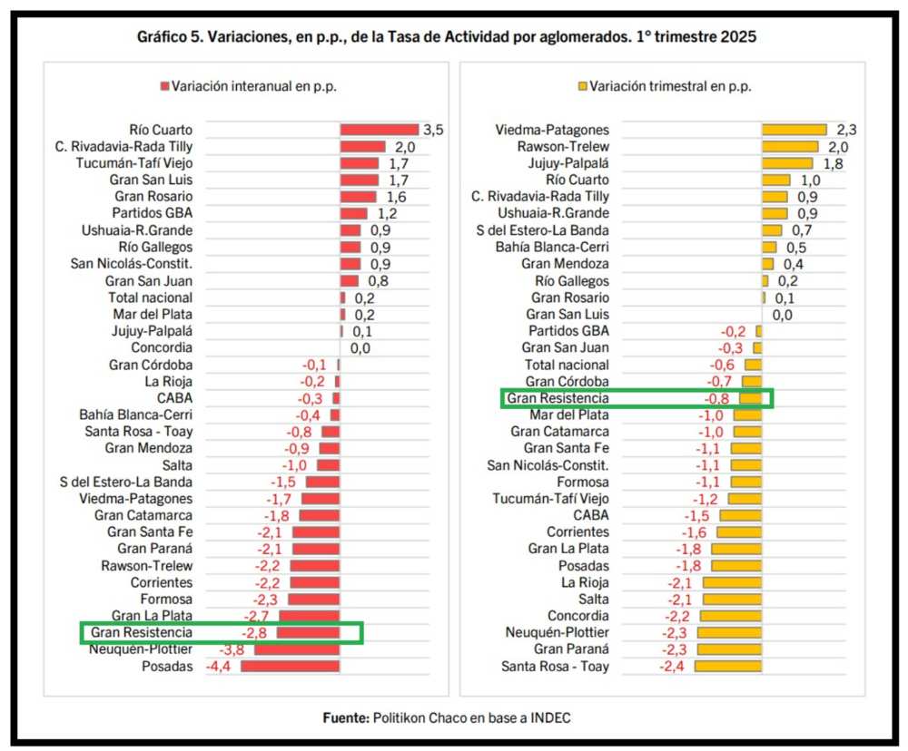Peor aún resulta la caída en la tasa de actividad respecto al año pasado: una baja de 2,8 puntos porcentuales, la tercera más pronunciada del país. También cayó respecto al último trimestre de 2024. Resistencia y sus ciudades satélites se hunden mientras otras, como Jujuy o Rawson-Trelew, lograron mejorar sus niveles de participación en el mercado.