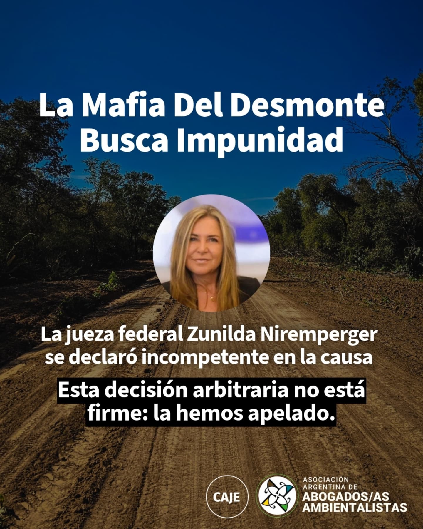 A través de sus redes sociales, la AAdeAA denunció que “la Mafia del Desmonte arrasa con los bosques nativos y ahora también opera activamente para desarmar y frenar la mayor causa judicial en su contra”. En ese sentido, aseguraron que “de manera intempestiva, la Jueza Federal Zunilda Niremperger se declaró incompetente en la causa penal, sin siquiera petición de parte”.