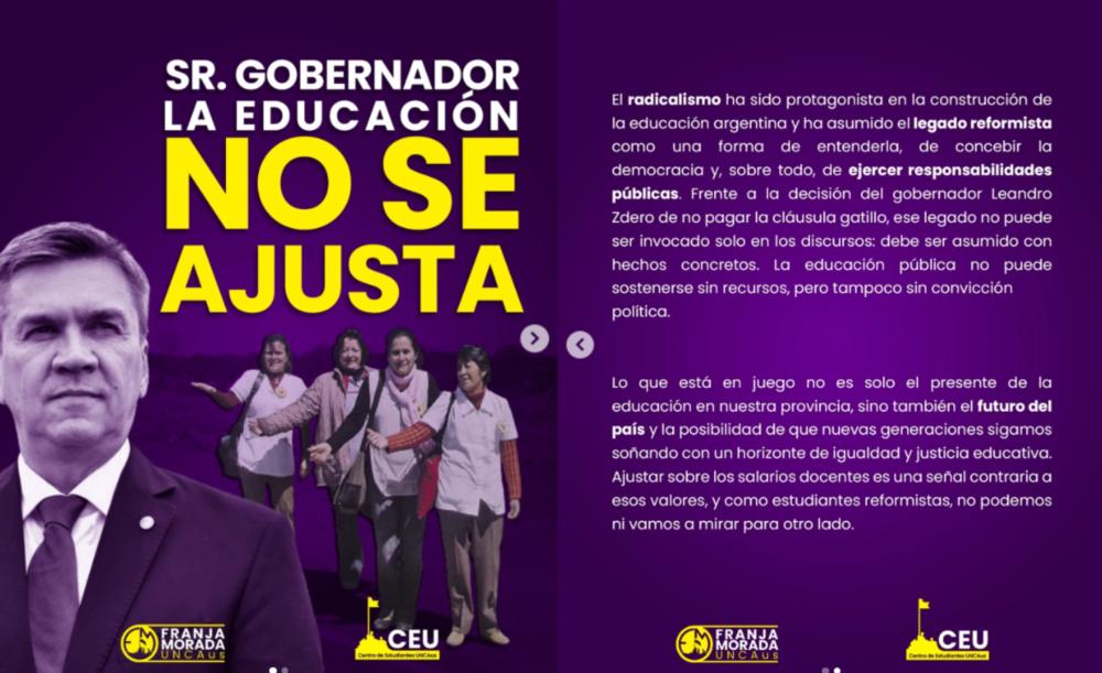 En un comunicado titulado “¡Sr. Gobernador, el ajuste no es con la educación!”, Franja Morada calificó la medida como un “ataque brutal” contra los docentes y la educación pública. “No se puede hablar de calidad educativa sin inversión. La cláusula gatillo es una herramienta fundamental para que los salarios no sean devorados por la inflación”, señalaron.