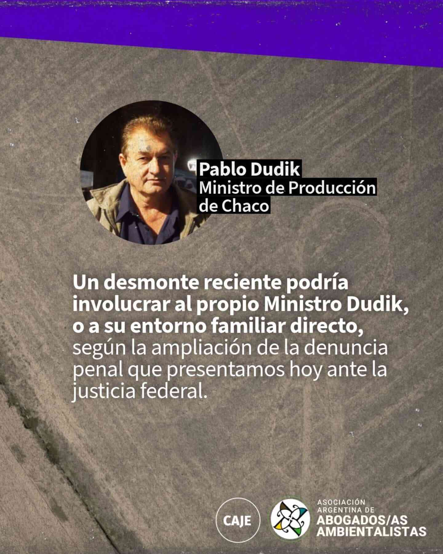 Lo que denuncian los abogados ambientalistas es que Dudik posee o poseia un campo en el cual se habria realizado un desmonte ilegal cuando ya estaba vigente la cautelar de la Jueza Niremperger. Si bien en los pasillos del ministerio se afirma que dicho campo ya no pertenece al ministro, en las actuaciones administrativas iniciadas se debería haber presentado la documentación que acredite la transferencia del predio, en vez paralizar su tratamiento e incluso archivarlas.