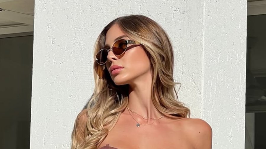 Para completar el look, la influencer sumó un par de lentes de sol rectangulares de armazón marrón y patillas finas, de inspiración 100% vintage, alineados con la paleta de colores tierra de la microbikini.