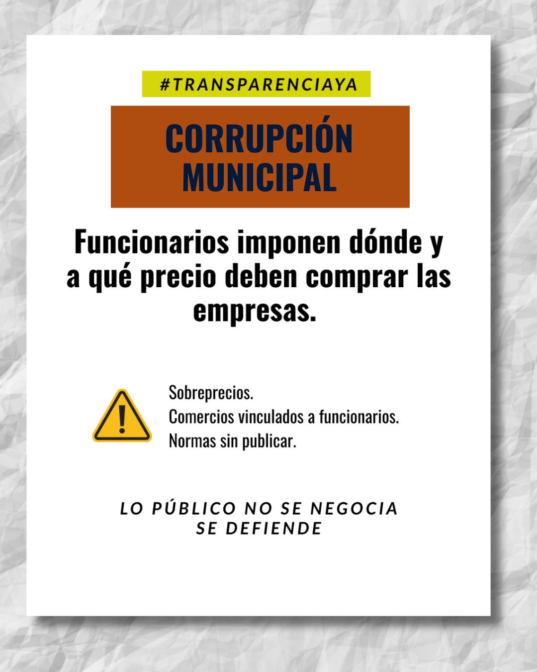 “La corrupción se perfecciona en la Municipalidad. Ya no solo afecta la administración pública, sino que distorsiona la actividad comercial y los precios de mercado. Funcionarios que deciden contrataciones imponen a los proveedores ganadores de licitaciones dónde deben comprar los insumos y a qué precios, que en algunos casos duplican los valores ofrecidos por otros comercios locales”, señaló el edil