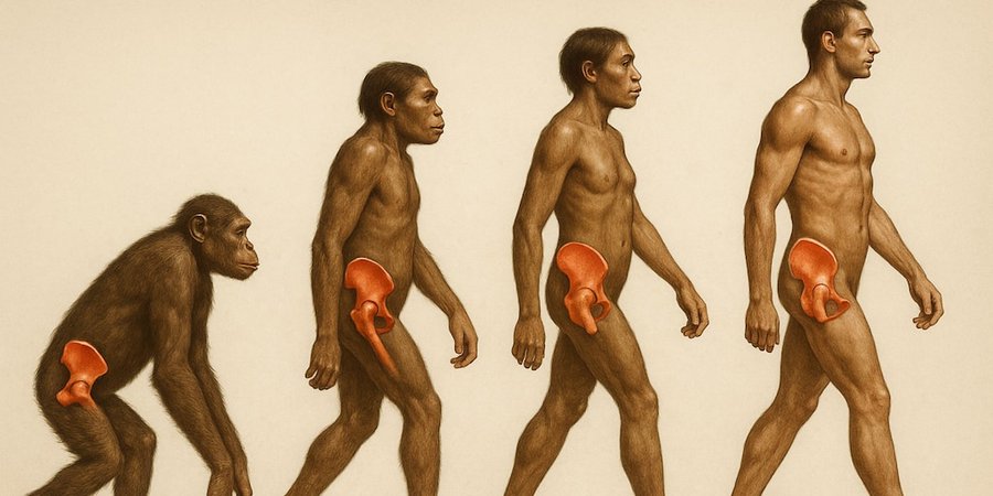 La pelvis, considerada la piedra angular de la marcha erguida, experimentó una transformación radical a lo largo de millones de años. En los simios africanos —como chimpancés, bonobos y gorilas— los huesos ilíacos son altos, estrechos y orientados de adelante hacia atrás, mientras que en los humanos estos huesos se han girado hacia los lados y forman una estructura ensanchada.