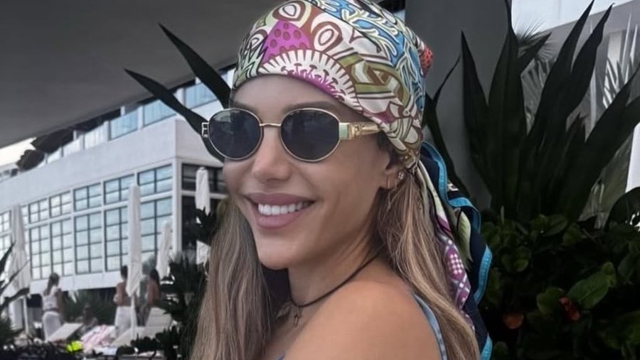 Más allá de marcar tendencia con su elección de traje de baño, Evangelina sumó otro complemento aliado que es furor entre las fashionistas: un pañuelo anudado en la cabeza. En este caso, un diseño con arabescos y formas abstractas en beige, celeste, verde, fucsia y bordó.
