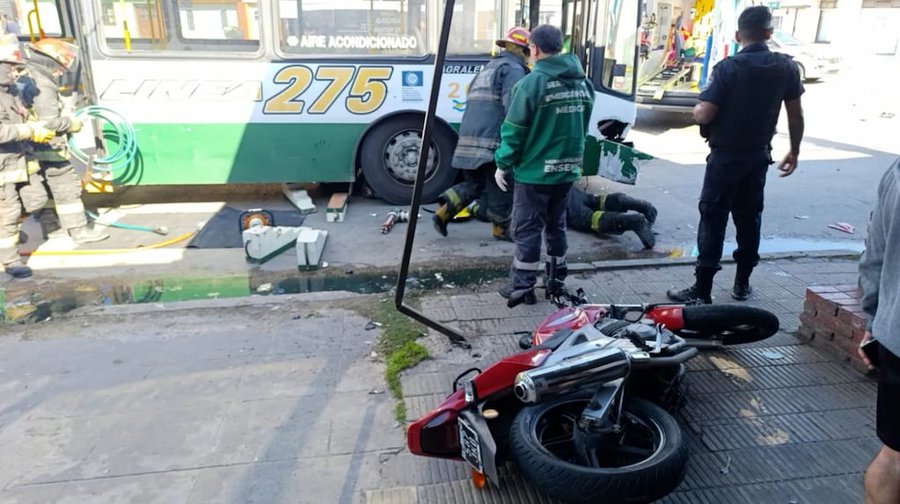 El dramático episodio comenzó cuando un Renault Clio intentó doblar en la esquina y embistió a una moto que circulaba por la avenida. El impacto fue tan fuerte que el motociclista salió despedido hacia el carril contrario y terminó debajo de un colectivo de la línea 275, que estaba detenido en el semáforo.