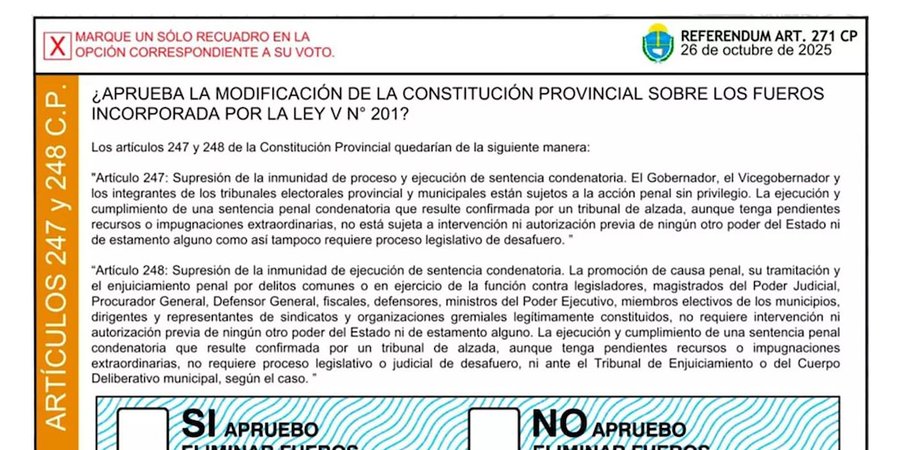 “¿Aprueba la modificación de la Constitución provincial sobre los fueros incorporada por la Ley V N° 201?”, dice en mayúsculas el encabezado de la boleta del referéndum, y al pie incluye dos casilleros para tildar la respuesta del votante, por el SÍ o el NO.