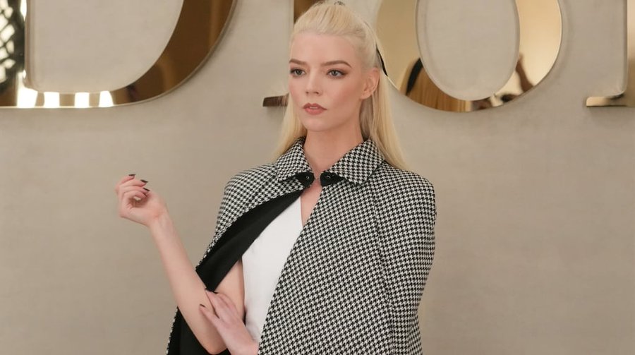 Anya Taylor-Joy, embajadora de la firma de lujo, asistió al desfile como todos los años y sorprendió con su apuesta de moda: top blanco, minifalda de estampado pied de poule en blanco y negro y gran capa a juego de terminación asimétrica. Un par de stilettos negros y un peinado semirecogio coronaron la apuesta.