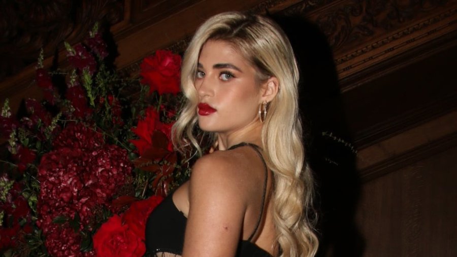 Lola Latorre apostó por un vestido corto de encaje floral translúcido con corset y minifalda voluminosa, estilo balloon, de Camila Romano. El diseño se completó con guantes de encaje al tono y sandalias a juego con plataformas XXL y tobillera con strass.