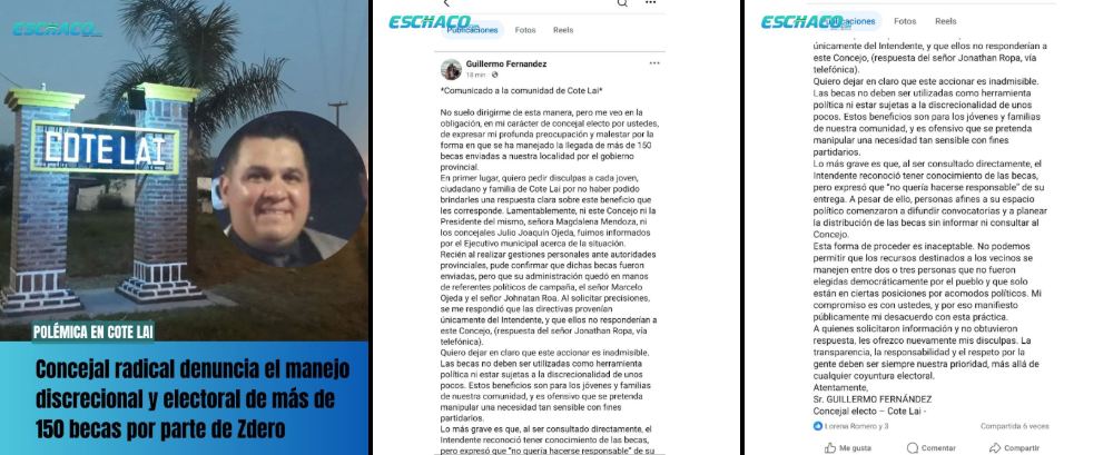 En un comunicado dirigido a la comunidad, el edil electo expresó su “profunda preocupación y malestar” por la falta de información oficial y el uso político de beneficios destinados a jóvenes y familias. Acusa al intendente de delegar la entrega en referentes de campaña sin consultar al Concejo. “Las becas no deben repartirse entre amigos”, advierte.