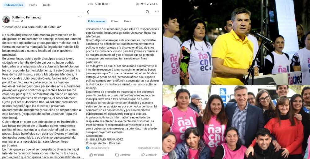 El propio concejal electo Guillermo Fernández, del radicalismo, denunció públicamente la situación en un comunicado dirigido a los vecinos de Cote Lai. Allí expresó su “profunda preocupación y malestar” por la llegada de más de 150 becas administradas por referentes de campaña afines al intendente Anselmo “Leli” Bordón, sin intervención del Concejo local.