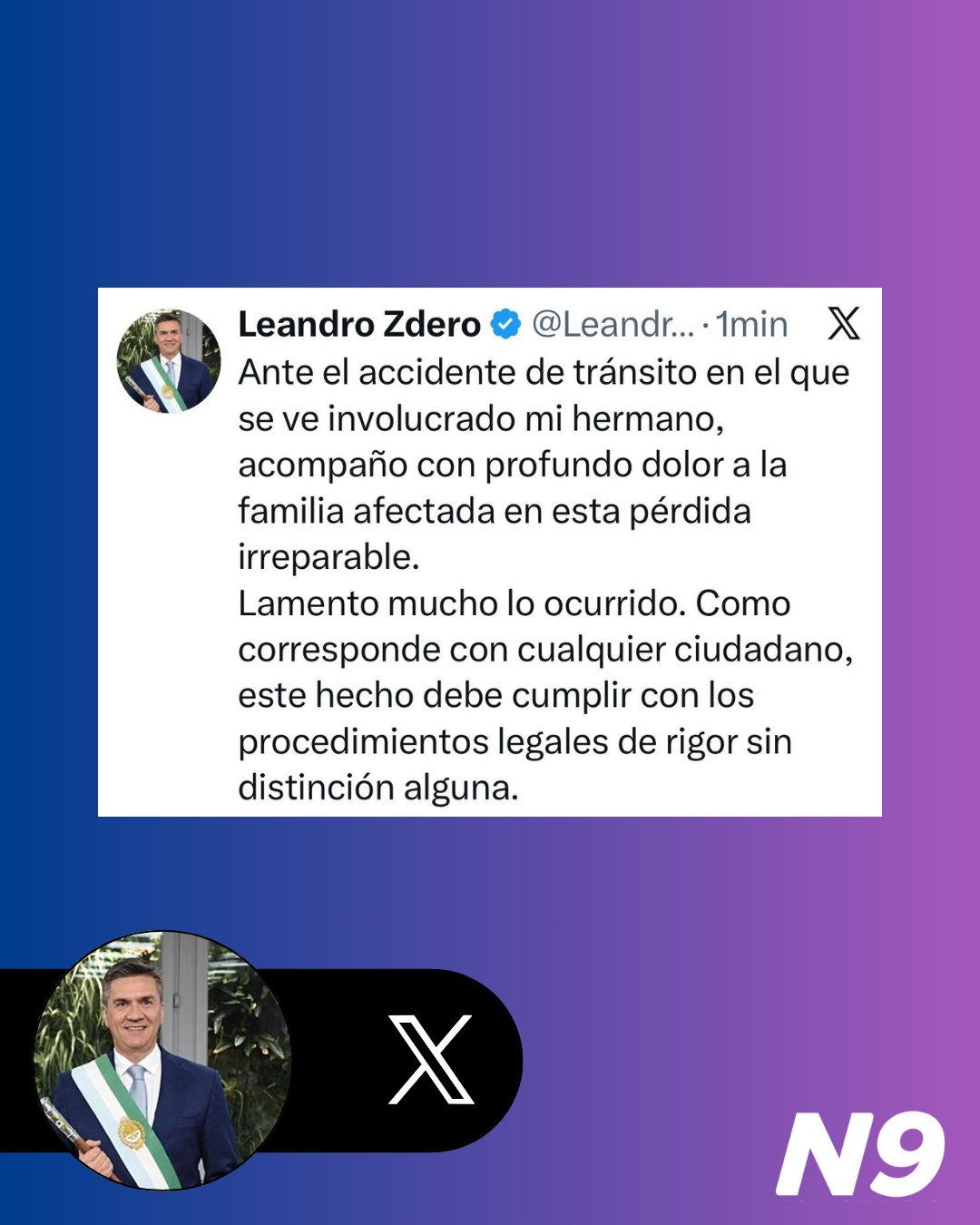 El mandatario chaqueño publicó un mensaje en redes luego del accidente en el que su hermano, Horacio “Chuleta” Zdero, protagonizara un accidente en el cual perdió la vida un peatón en Quitilipi.. La Justicia imputó al conductor y confirmó que el test de alcoholemia dio 0.00.