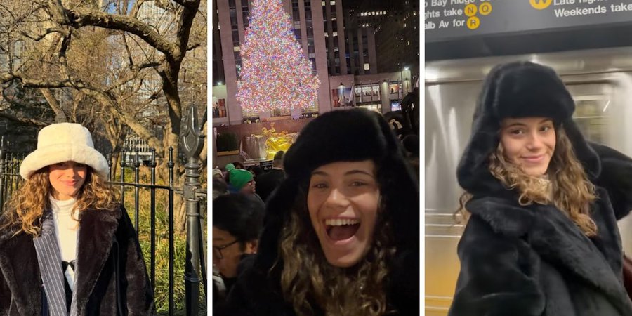 El día de la platense en Nueva York comenzó con la emoción propia de quien está viviendo una experiencia completamente nueva. En la habitación del hotel, todavía rodeada por la valija abierta y el desorden característico del primer día, la intérprete grabó su “primer outfit check”. Frente al espejo, luciendo una combinación invernal con tapado de piel sintética negro, sweater a rayas, camisa y un gorro de piel que marcó su estilo durante toda la jornada.