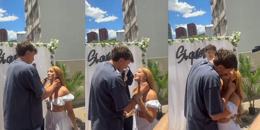 La hija de Gloria Carrá dejó de lado el conjunto que tenía puesto para cambiarlo con un look de color blanco, subió a la terraza del edificio y llevó adelante la falsa boda con Teo. La escena del esperado beso estuvo cargada de sorpresas, dramatismo y tintes de telenovela, propia de un desenlace de “boda interrumpida” en la ficción. Todo sucedió durante una ceremonia en donde, antes de declararlos marido y mujer, el oficiante lanzó la pregunta tradicional: “¿Algunos de los que están aquí presentes se opone a la boda y al casamiento?” De fondo, la música y el murmullo aumentaban la tensión del momento.