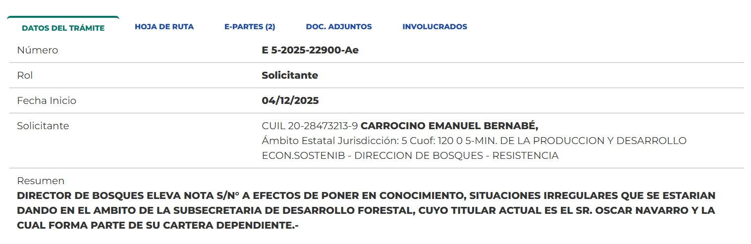 Pero la situación no termina allí. La presentación también advierte sobre serias irregularidades en actuaciones administrativas vinculadas a desmontes ilegales, particularmente en el expediente electrónico E5-2025-6827-Ae, relacionado con un desmonte sin autorización ocurrido en abril de 2025.