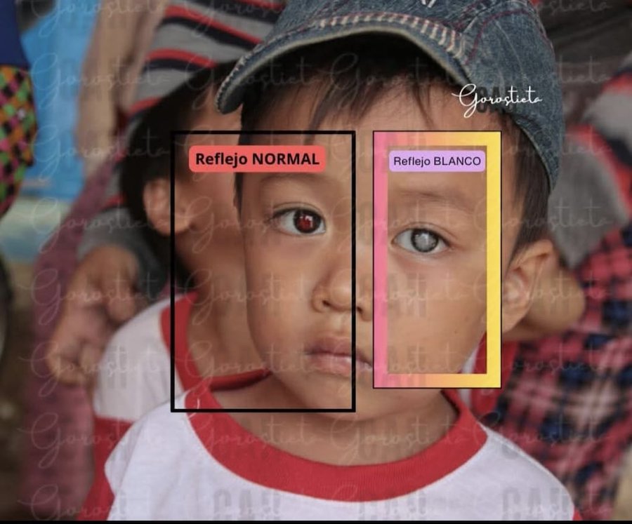 - Leucocoria: reflejo blanquecino o plateado en la pupila, visible especialmente en fotos con flash.