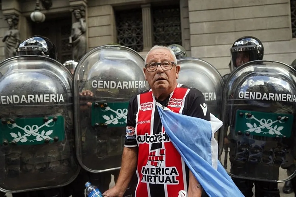 «Lamentablemente lo que pasó fue una cacería humana. Cuando empezaron a reprimir, parecía una manada. Era terrible como salieron a agredir los policías y los gendarmes a la gente. Y yo dije, ‘no puede ser, los voy a ir a encarar’. Y los encaré. Junto con una fotógrafa, los dos abrazados», contó el jubilado en una entrevista para Somos Radio AM 530.