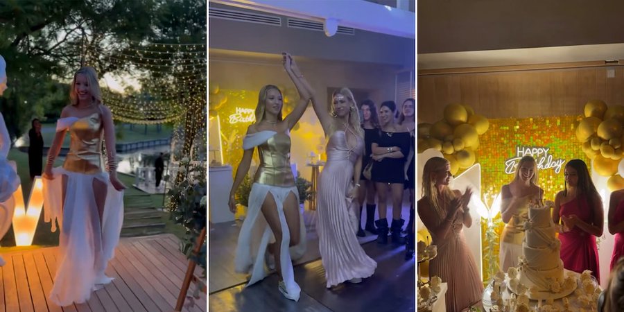El atuendo de Allegra Cubero centró las miradas al inicio de la noche. La cumpleañera llevó un vestido de inspiración griega confeccionado por Laurencio Adot, con corset metálico dorado, falda de gasa con tajos y escote asimétrico con detalles en cuero dorado, evocando la figura de una diosa helénica.