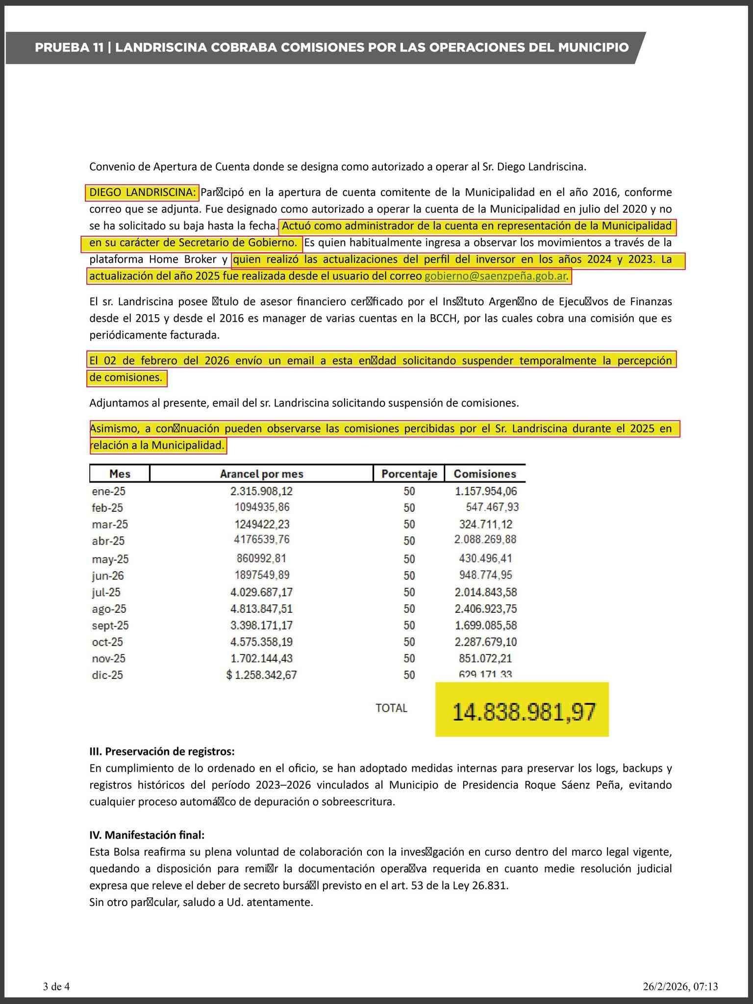 De acuerdo con la documentación presentada, además de su función como secretario de Gobierno, Landriscina figura como mánager de cuentas en la Bolsa de Comercio del Chaco y habría percibido comisiones vinculadas a la operatoria. Según los registros incorporados, solo en 2025 habría recibido más de 15 millones de pesos en concepto de comisiones.