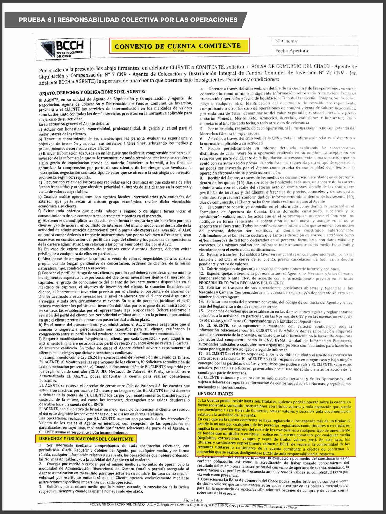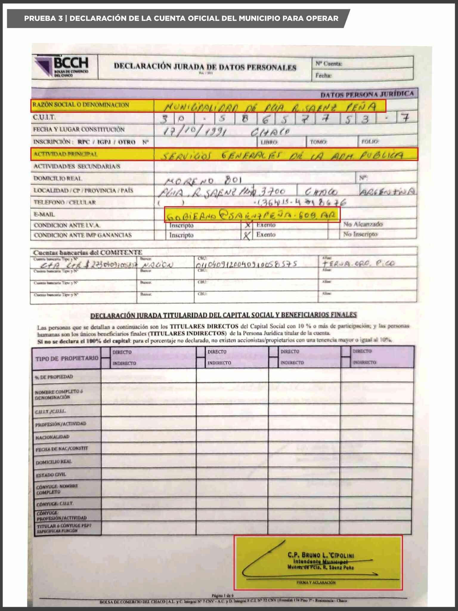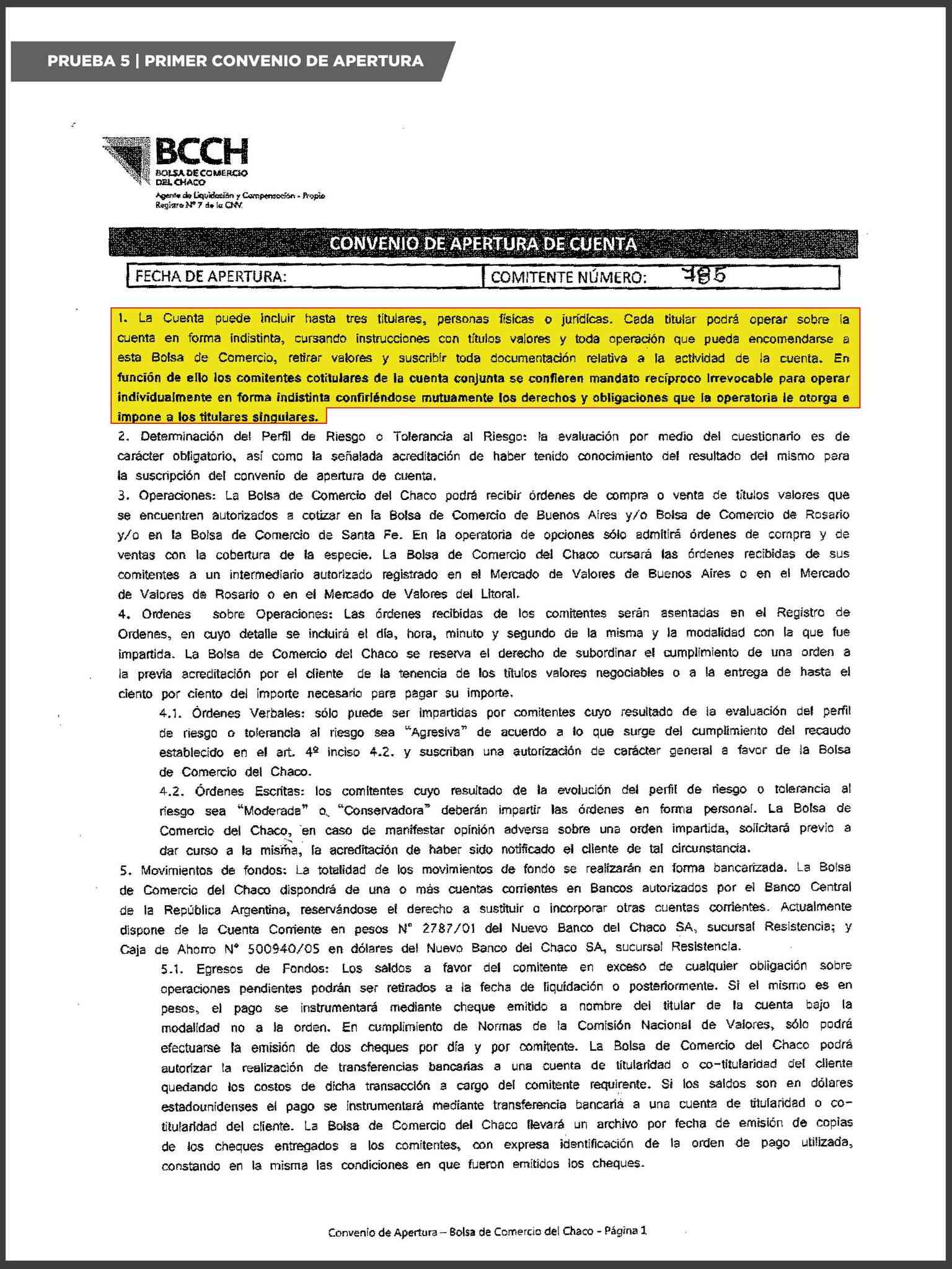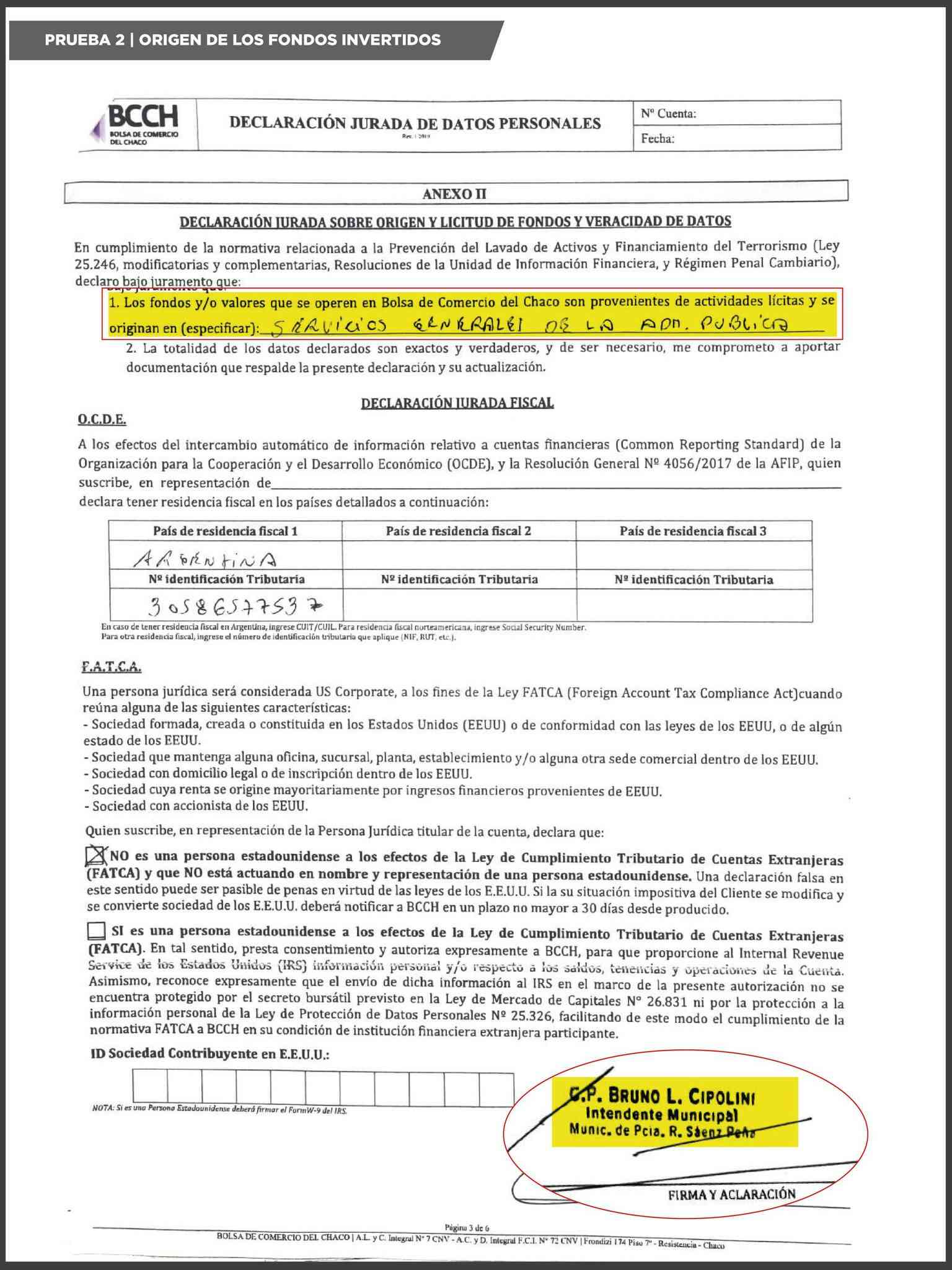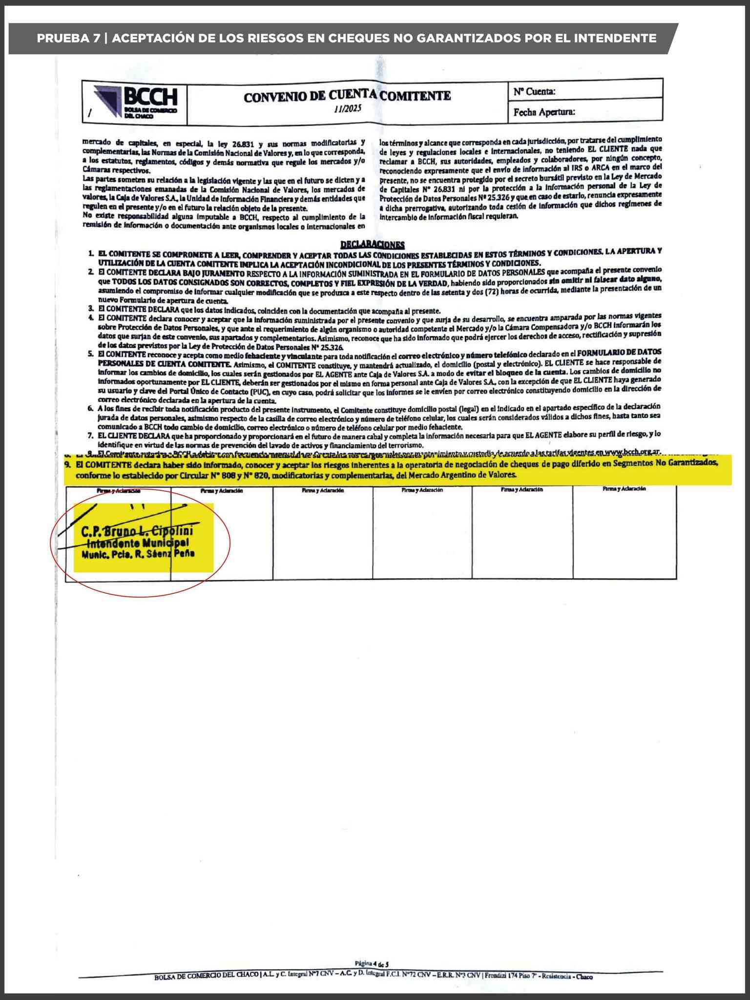 En ese marco, sostuvo que el propio intendente firmó la apertura de la cuenta comitente ante la Bolsa de Comercio del Chaco, declaró el origen público de los fondos y aceptó expresamente los riesgos inherentes a la operatoria.