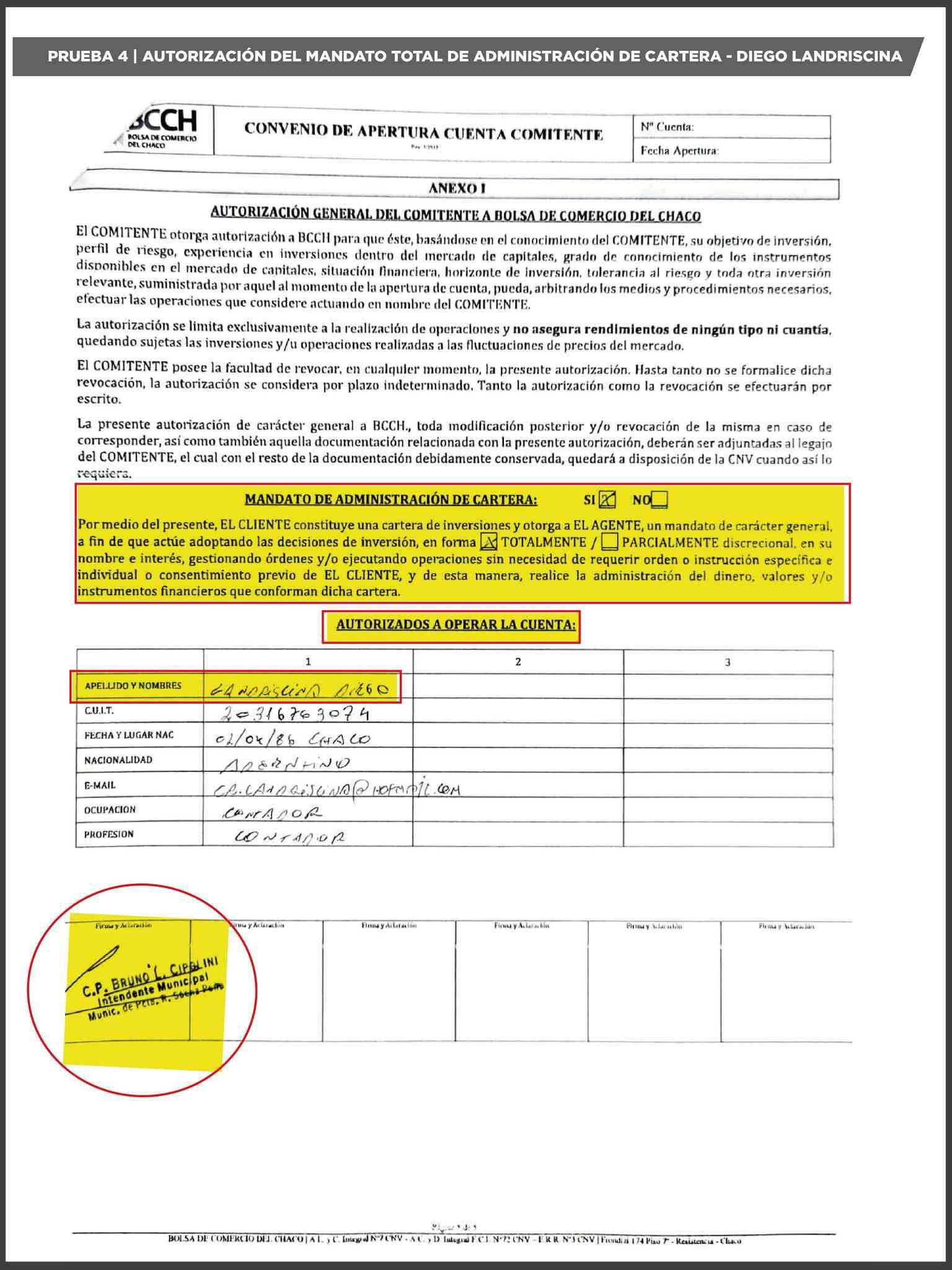 Otro de los puntos incorporados a la causa refiere al rol de Diego Landriscina, autorizado a operar la cuenta comitente del Municipio.