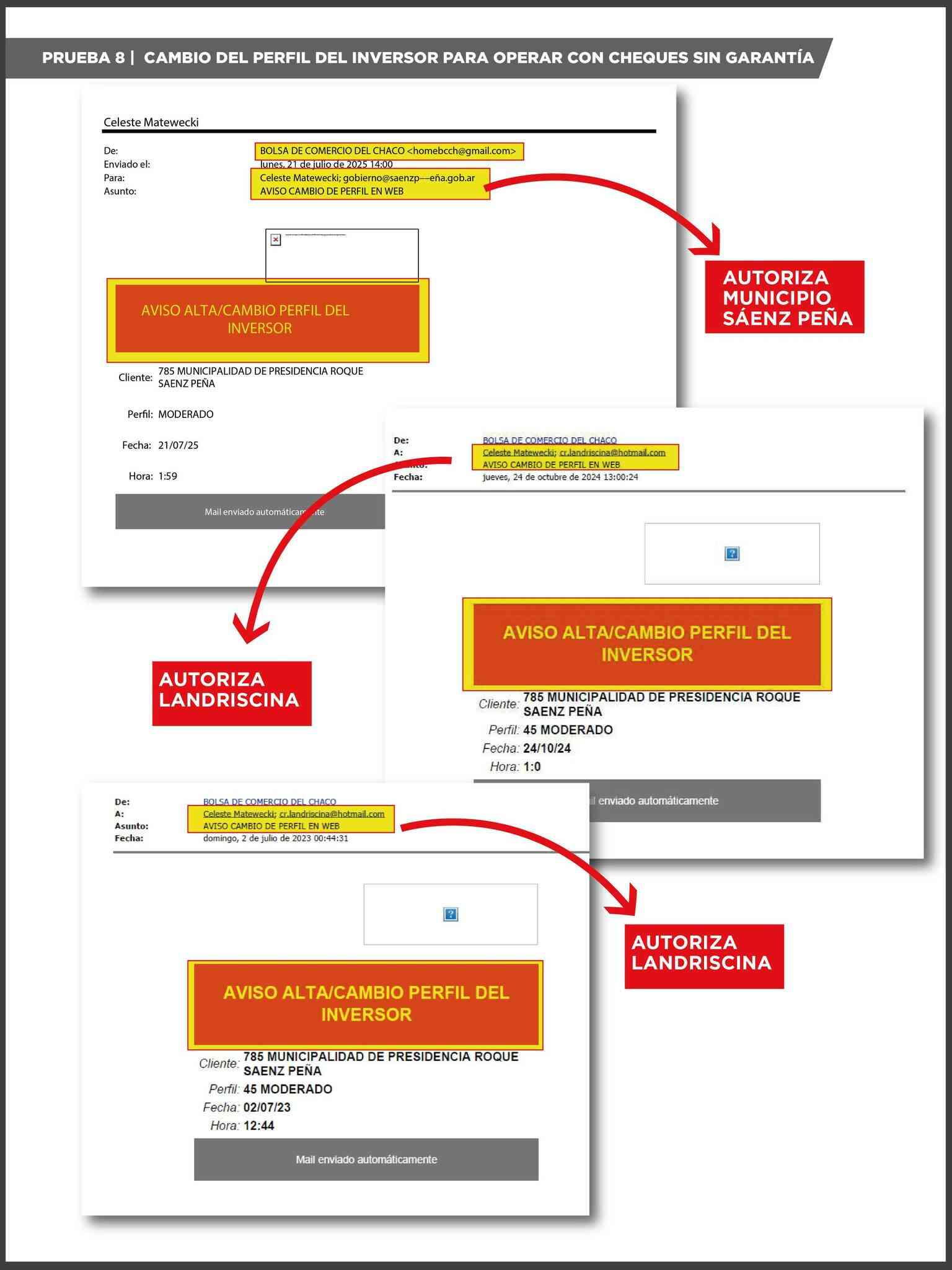 Entre las pruebas aportadas se incluyen constancias de modificación del perfil inversor del Municipio, paso indispensable para acceder a instrumentos financieros más riesgosos, incompatibles con la obligación legal de un municipio de mantener un perfil conservador.