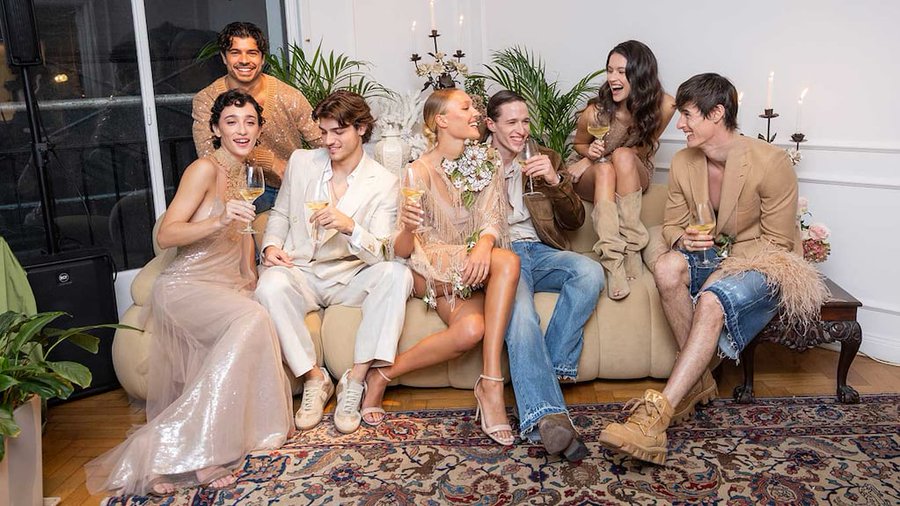 Los looks de los jóvenes invitados, muchos de ellos posando relajados sobre un sillón de terciopelo beige con copas de vino blanco, fueron una muestra de esta evolución. Se vieron vestidos de lentejuelas brillantes en tonos nude y champán, algunos con detalles de plumas en el bajo o en los hombros. Un minivestido nude de malla con flecos y apliques florales en un hombro.
