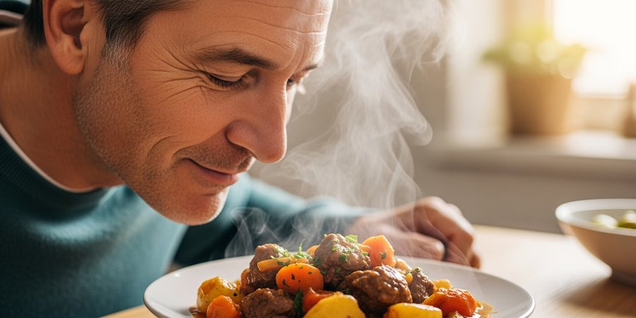 Primer plano de un hombre de unos 50 años con pelo canoso y jersey verde, oliendo un plato de estofado caliente con carne, patatas y zanahorias, con vapor ascendiendo.El deterioro del olfato con la edad impacta directamente en la percepción del sabor y modifica la experiencia alimentaria (Imagen Ilustrativa Infobae)