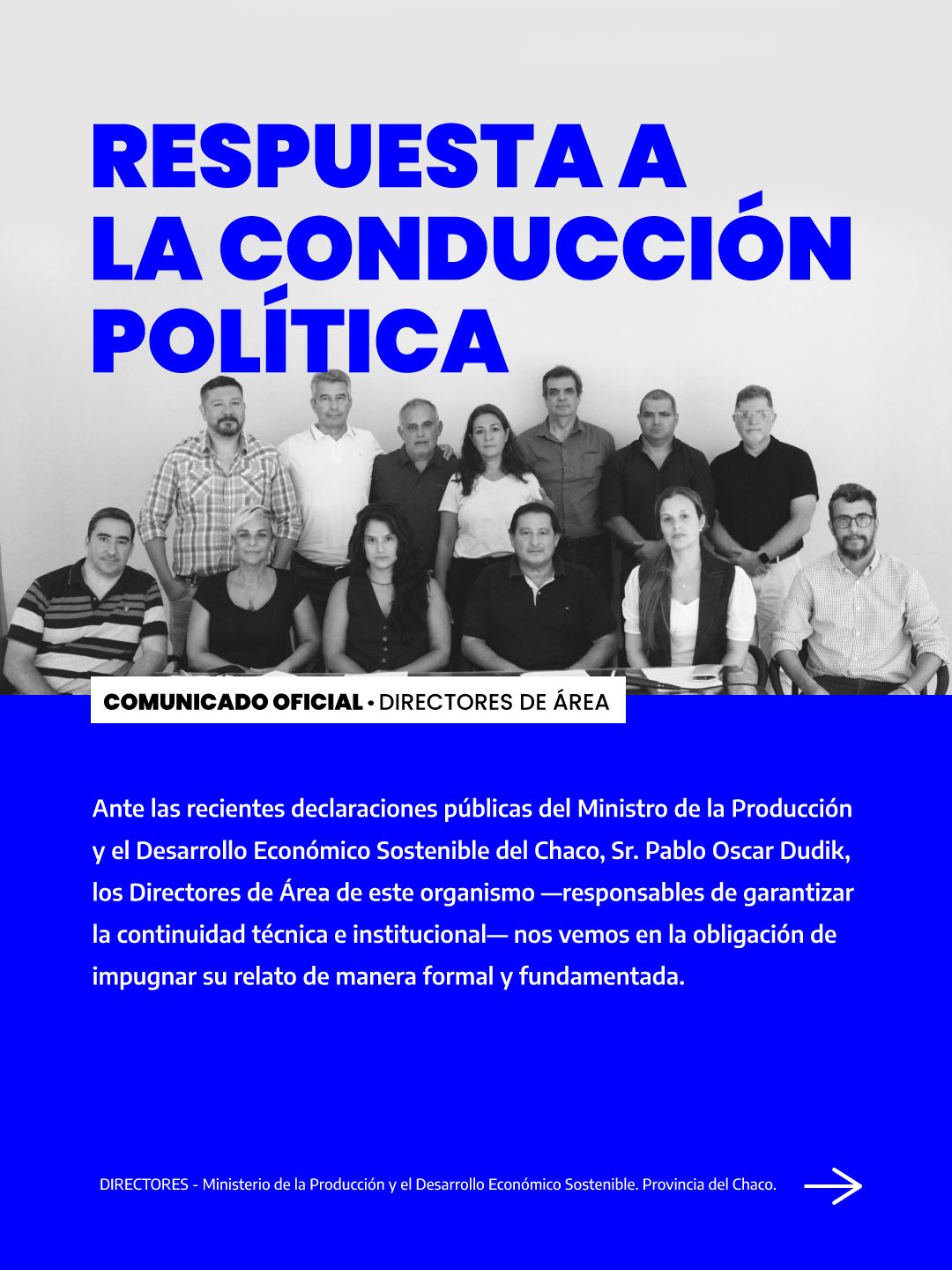 Los directores de Área del Ministerio de la Producción emitieron un duro comunicado oficial en respuesta a las recientes declaraciones del ministro Oscar Dudik, quien intentó deslegitimar el reclamo de los trabajadores calificándolo de “violento” y “partidario”, todo cuando ya pasaron varios días del fallo judicial que obliga al gobierno de Leandro Zdero a pagar el sueldo completo de los agentes de la cartera.