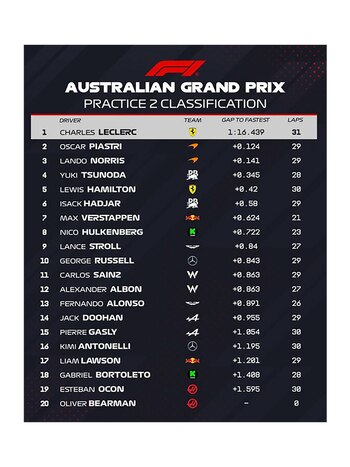 En los minutos finales de la sesión, Leclerc logró su mejor vuelta y se adueñó del primer puesto con un tiempo de 1:16.439, superando por 124 milésimas a Piastri y por 141 a Norris. Hamilton terminó en la quinta posición con 1:16.859, a 420 milésimas de su compañero en Ferrari.