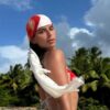 Deslumbró con un traje de baño de dos piezas desde una playa paradisíaca. Desde una playa tropical puertorriqueña, rodeada de palmeras sobre arena dorada...