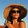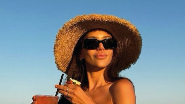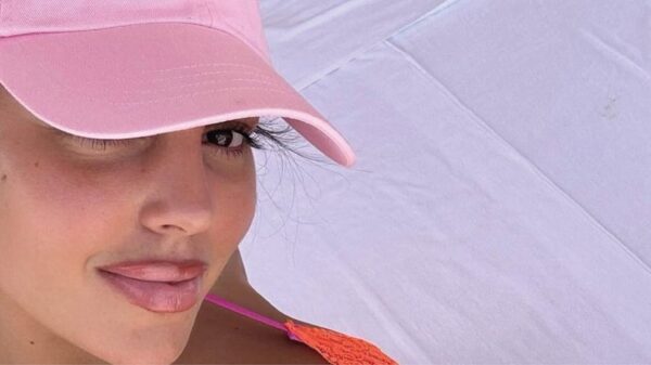 Desde la playa, completó la apuesta con un cap rosa.
