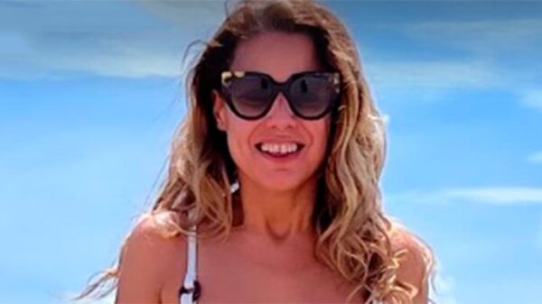 Posó a orillas del mar con un traje de baño con aberturas importantes en los laterales y detalle de arandela en el escote.
