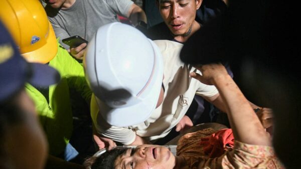 Phyu Lay Khaing, de 30 años, fue sacada del Sky Villa Condominium y llevada en camilla para ser abrazada por su esposo, Ye Aung,...